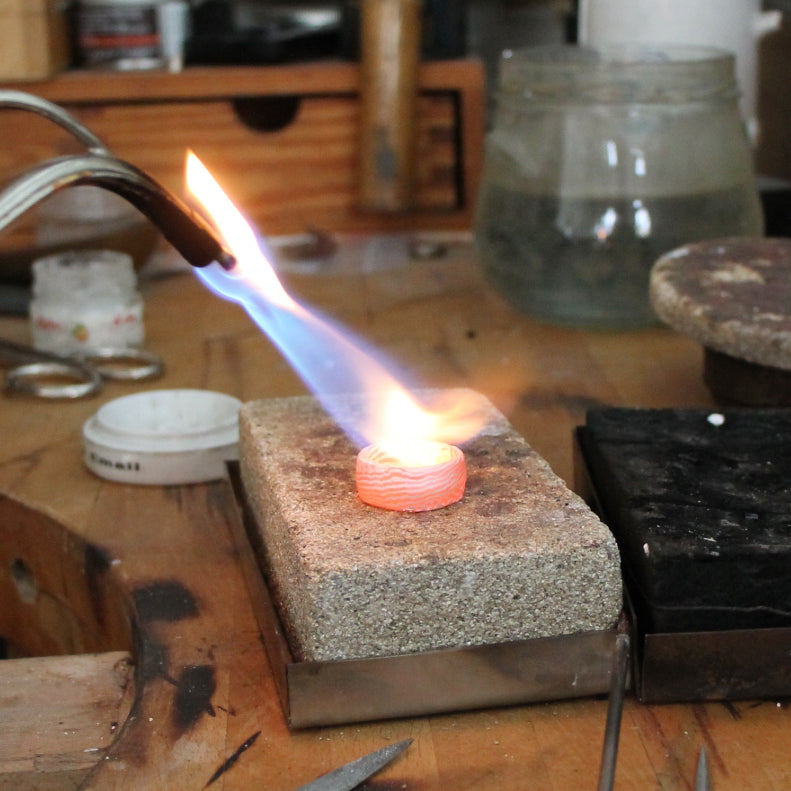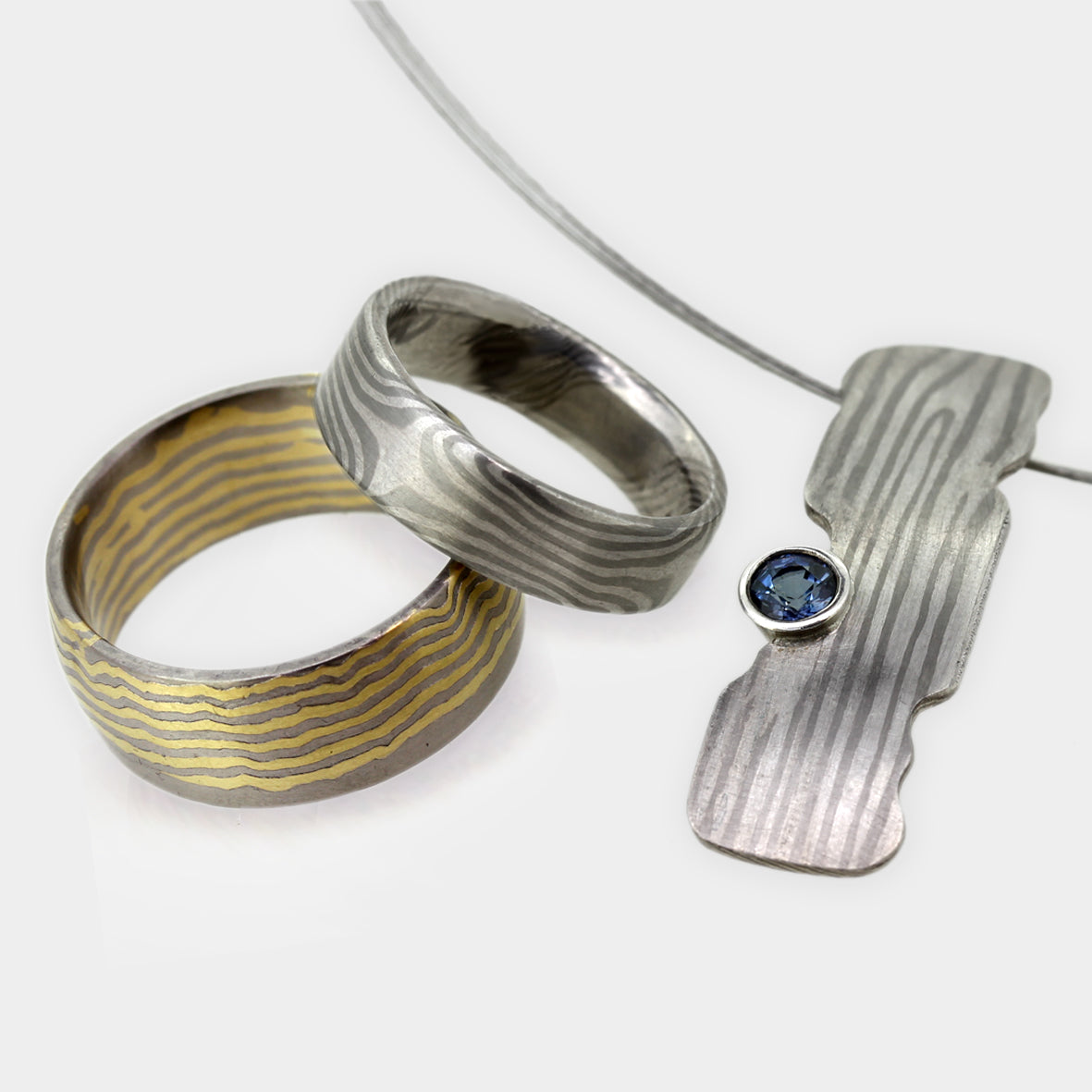 Durch diese alte japanische Schmiedekunst entstehen faszinierende Farb- und Materialkontraste. Wir verbinden unterschiedliche Edelmetalle und erzeugen druch spezielle Schmiedetechniken gezielt Muster und Strukturen in unseren Schmuckstücken.
