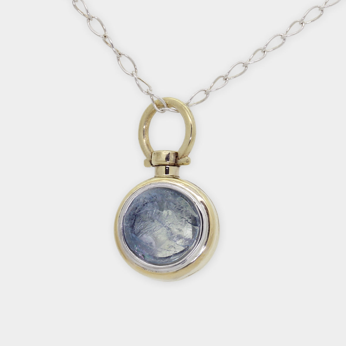 Das Gehäuse einer antiken goldenen Taschenuhr wurde zu diesem Schmuckstück umgestaltet. Das Werk war defekt, daher haben wir anstatt des Uhrwerkes einen Aquamarin mit ungeschlifener Oberfläche eingesetzt.