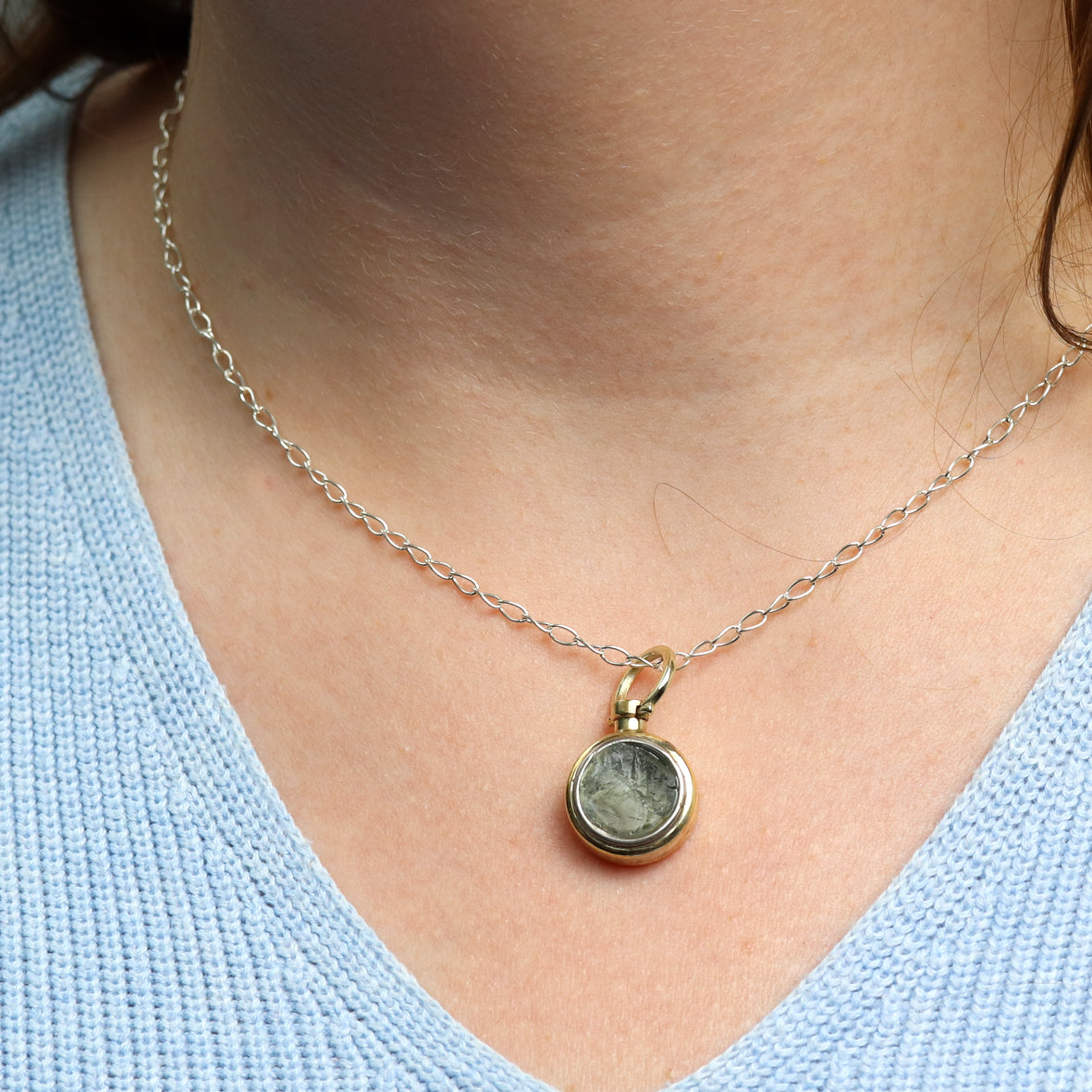 Die ungeschliffene Oberfläche des Aquamarins fängt das Licht auf einzigartige Weise ein und die klare, himmelblaue Farbe des Rohsteins bildet einen faszinierenden Kontrast zum warmen Glanz des Goldes. Natur trifft auf Nostalgie