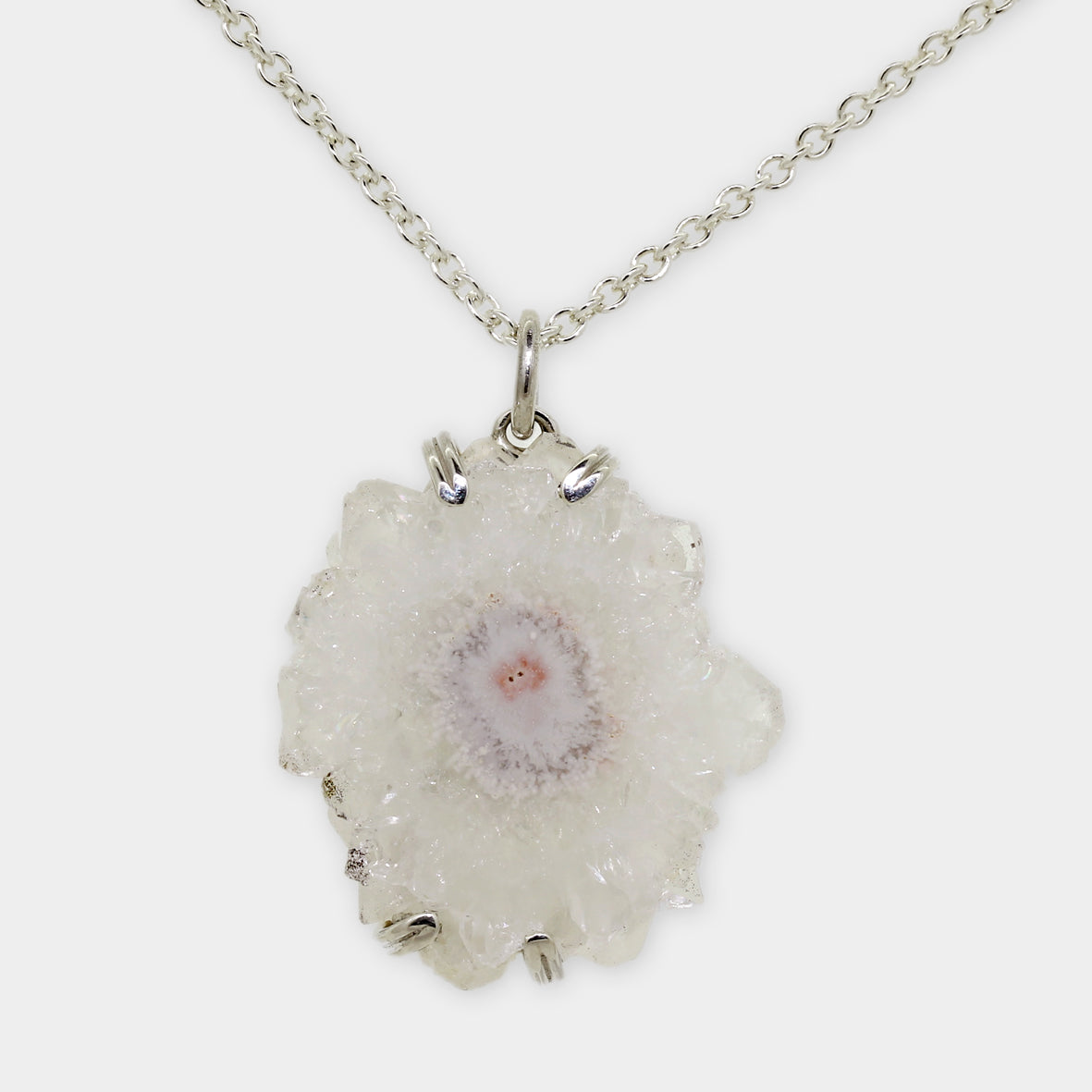 Die glatte, polierte Quarzkristall-Scheibe wird von doppelten Silberkrappen gehalten. Diese Art der Fassung betont die natürliche Form und Transparenz der Quarzscheibe, indem sie das Sichtfeld auf den Stein offen lässt und dennoch sicher hält. Dieser Anhänger vereint die reine Schönheit des Quarzkristalls mit der kühlen Eleganz von Sterlingsilber.