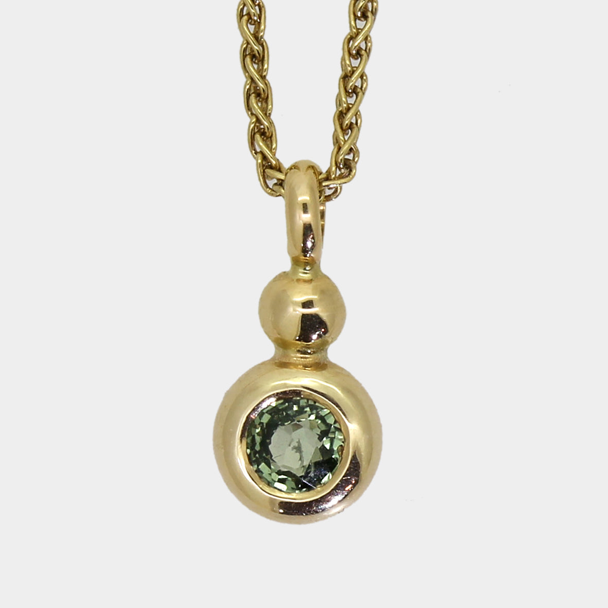 Der runde Turmalin eignet sich sehr gut für ein klassisches, zeitloses Schmuckstück wie einen Anhänger. Eine schlichte, bauchige Zargenfassung schützt den Turmalin und bringt die Form klar zur Geltung, Der warme Farbton des 585‰ Gold unterstreicht den schönen Grünton des Steines.