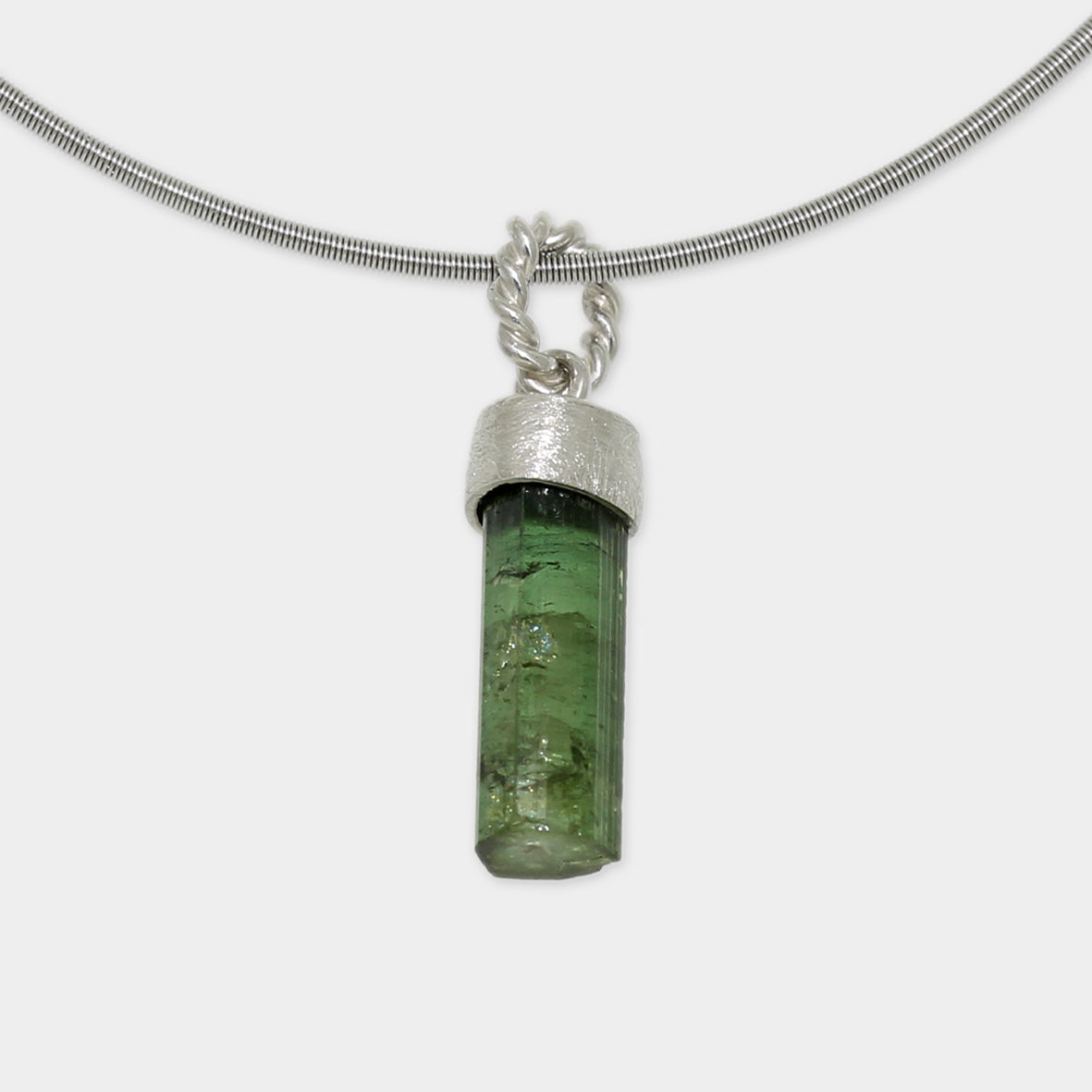 Dieser Turmalinkristall ist ein natürlicher Edelstein, dessen Flächen nicht geschliffen wurden. Der Turmalin zeigt je nach Lichteinfall feine Farbnuancen und schimmernde Strukturen, die seine kristalline Herkunft betonen. Eingefasst in edles Sterlingsilber entsteht ein Schmuckstück von zeitloser Eleganz und ausdrucksstarker Wirkung.