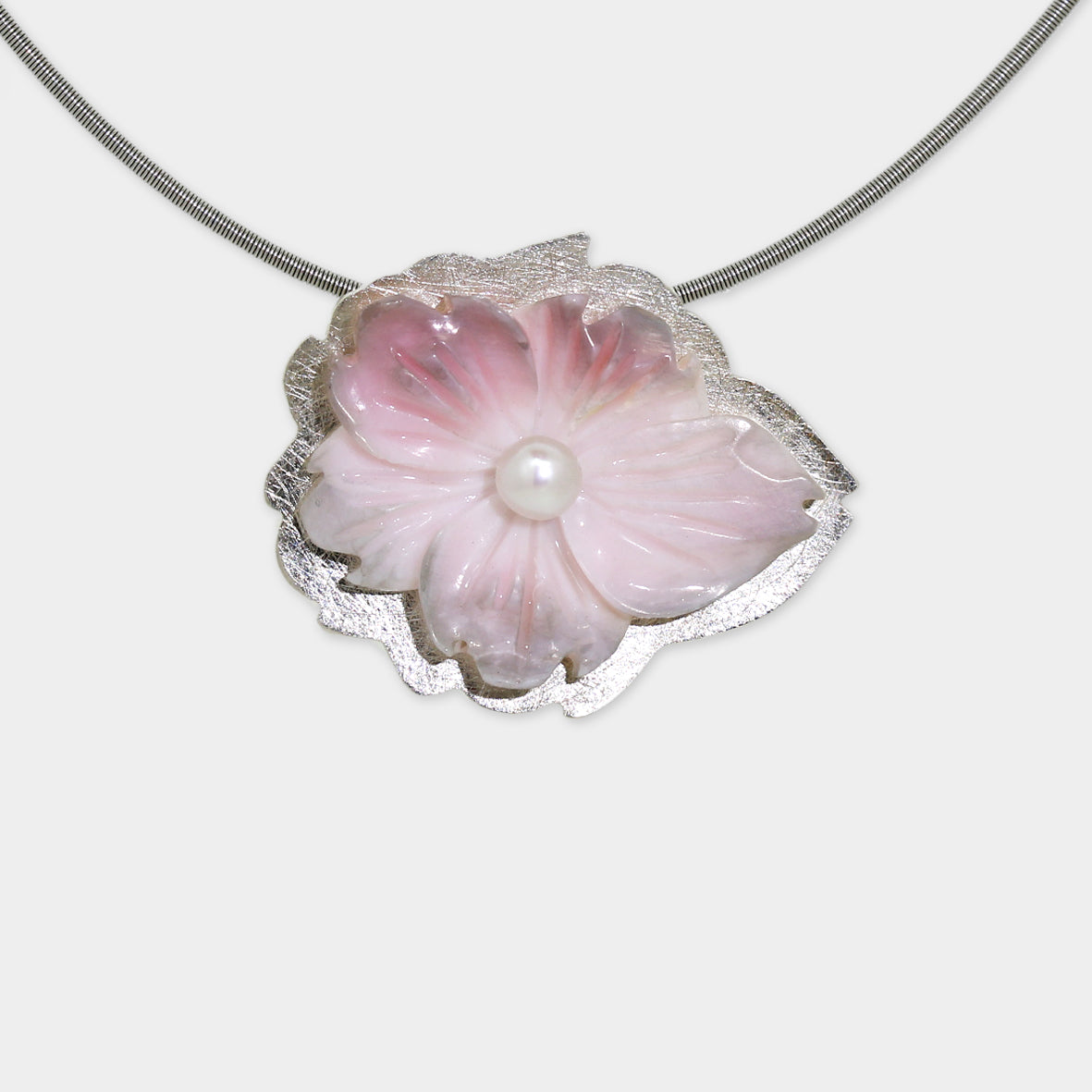 Die Blüte ist kunstvoll aus echter Koralle gefertigt. Die warmen Rosétöne der Koralle kontrastieren wunderschön mit dem kühlen Glanz des Silbers – ein Schmuckstück, das sowohl zart als auch ausdrucksstark wirkt.