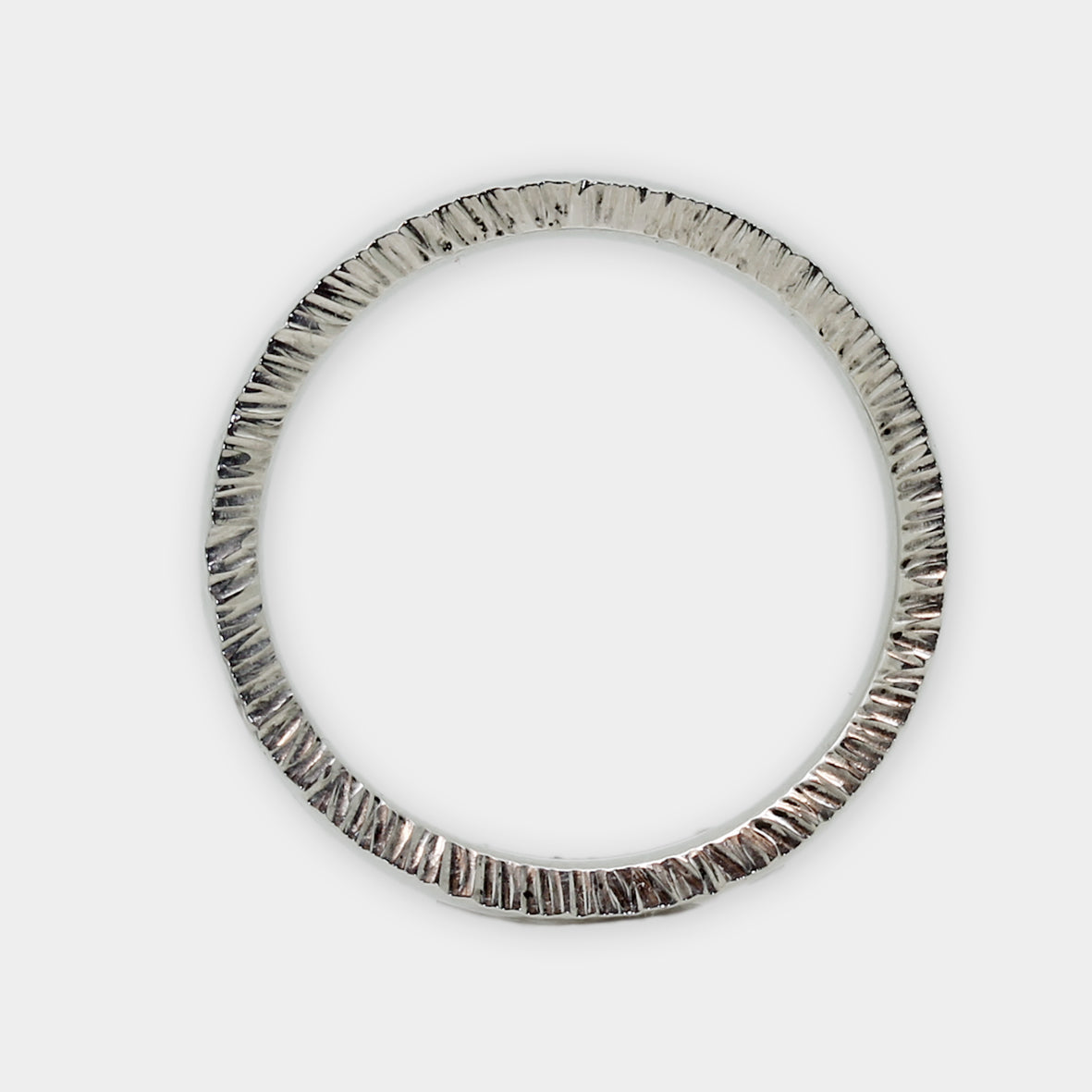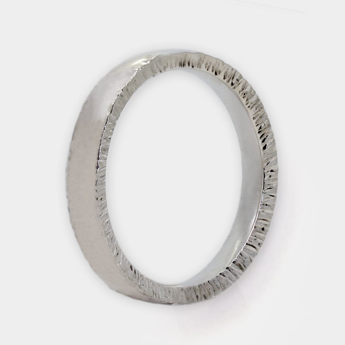 Bei diesem Ring ist die besondere Struktur nicht oben auf der Fläche, sondern seitlich an der Ringschiene gestaltet. Der Ring wirkt eher schlicht von oben, zeigt seine besondere Optik aber deutlich in der Seitenansicht.