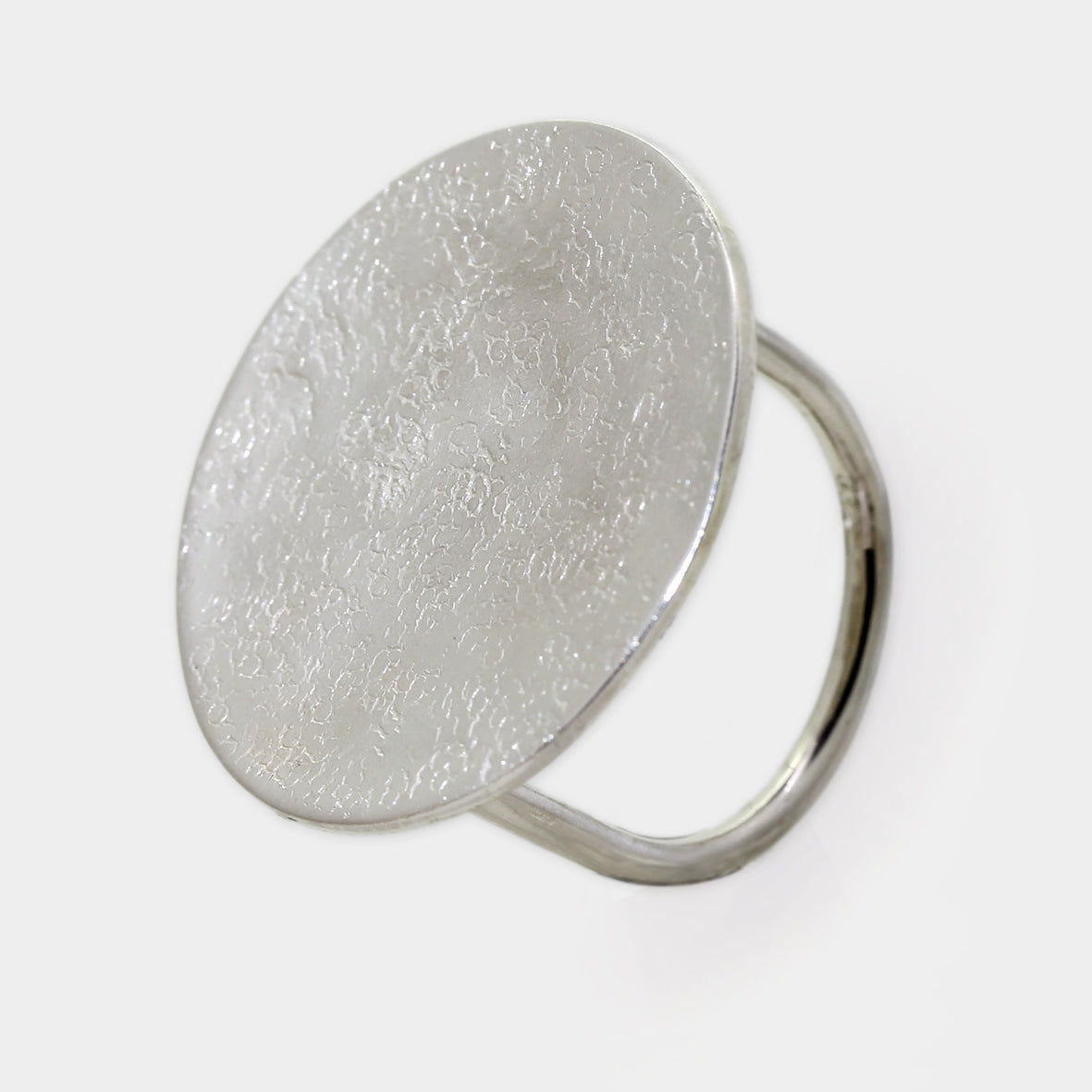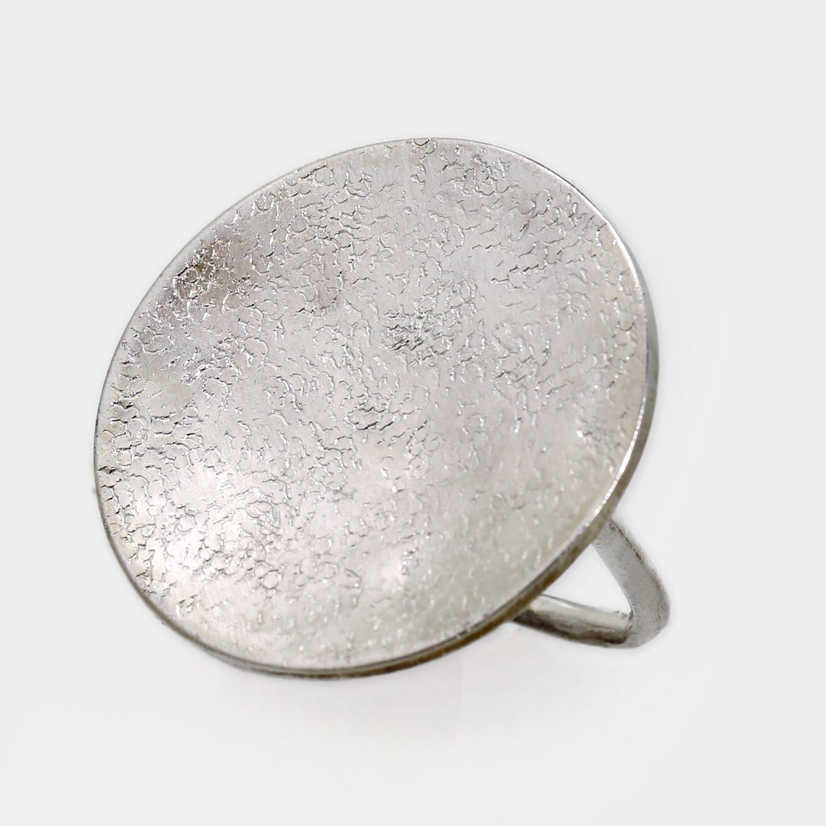 Der Ring besteht aus einer U-förmigen Ringschiene. Dieser "U-Ring" sorgt für hohen Tragekomfort und Stabilität. Auf der Schiene sitzt eine große runde, leicht gewölbte Scheibe mit einer strukturieren Oberfläche.
