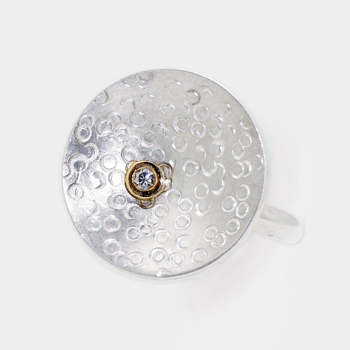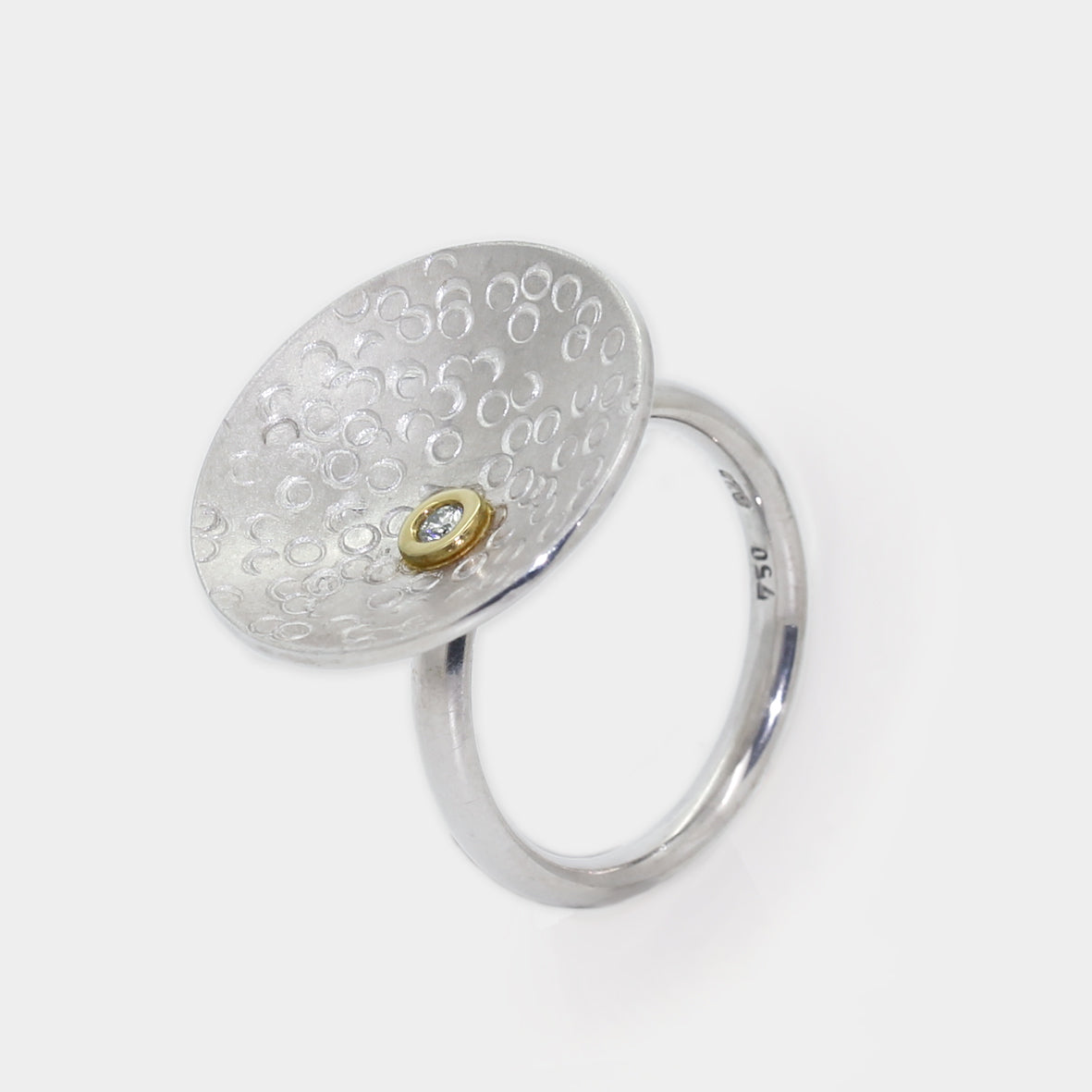 Der Ring besteht aus einer schmalen Ringschiene. Auf der Schiene sitzt eine große runde, leicht gewölbte Scheibe mit einer strukturieren Oberfläche.