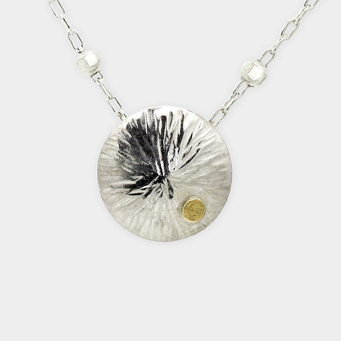 Die Basis des Anhängers bildet eine Silberscheibe mit einer einzigartigen Struktur. Dies verleiht dem Silber einen lebendigen und matt schimmernden Look. Ein Goldnugget aus 585er Gelbgold sitzt gezielt als dekorative Akzent auf der Silberscheibe. Die Oberfläche der Silberscheibe betont durch die Struktur das Spiel von Licht und Schatten und hebt die Goldnuggets besonders hervor.