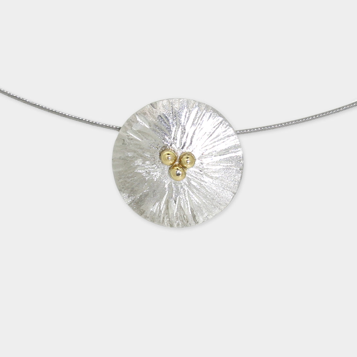 Die Basis des Anhängers bildet eine Silberscheibe mit einer einzigartigen Struktur. Dies verleiht dem Silber einen lebendigen und matt schimmernden Look. Goldnuggets aus 750er Gelbgold sitzen gezielt als dekorative Akzente auf der Silberscheibe. Die Oberfläche der Silberscheibe betont durch die Struktur das Spiel von Licht und Schatten und hebt die Goldnuggets besonders hervor.