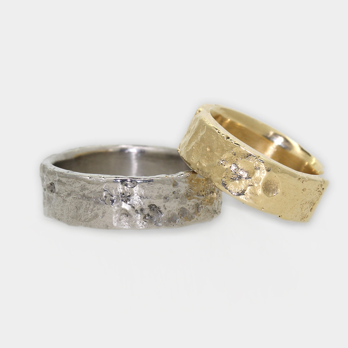 Die auffällige, fühl- und sichtbaren Strukturen verleihen den Ringen eine besondere Tiefe und Ausdruckskraft, die sowohl Robustheit als auch Eleganz ausstrahlt. Dabei wird die Oberfläche bewusst unregelmäßig gestaltet, um eine lebendige Struktur zu schaffen, die das Licht auf eindrucksvolle Weise reflektiert und so jeden Blick fesselt.