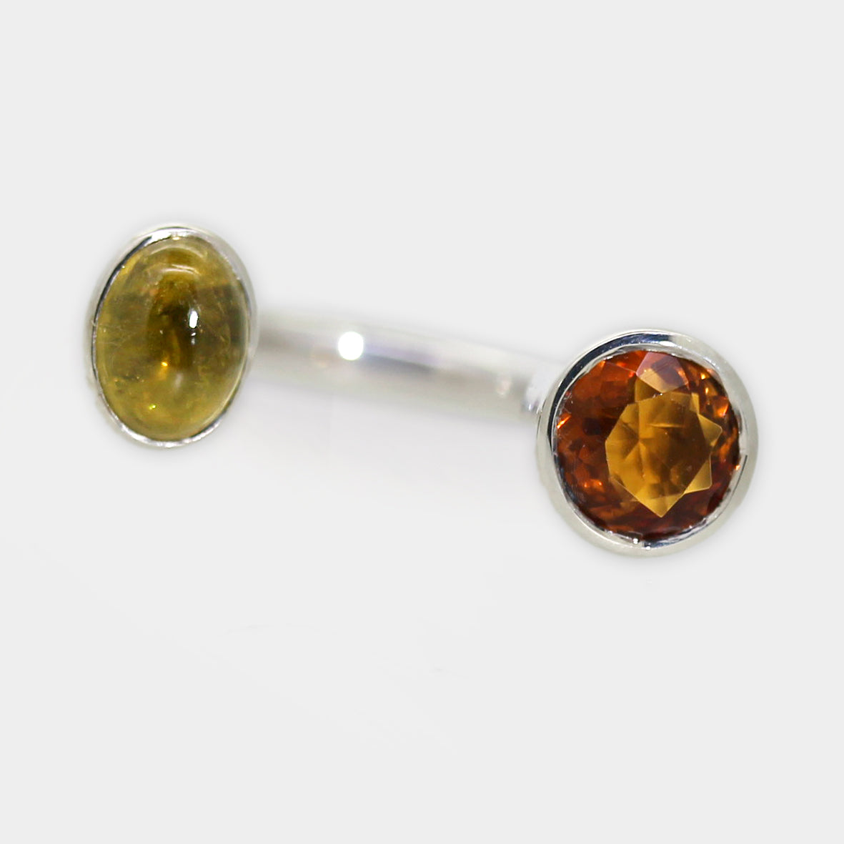 Moderner U‑Ring aus Silber mit Turmalin und Citrin. Der Ring vereint modernes Design mit kontrastreichen Steinformen: ein ovaler gelblichgrüner Turmalin-Cabochon auf der einen Seite und gegenüber ein funkelnder runder Citrin. Das glänzende Silber der Fassungen und der Ringschiene setzt die Farbharmonie stilvoll in Szene.