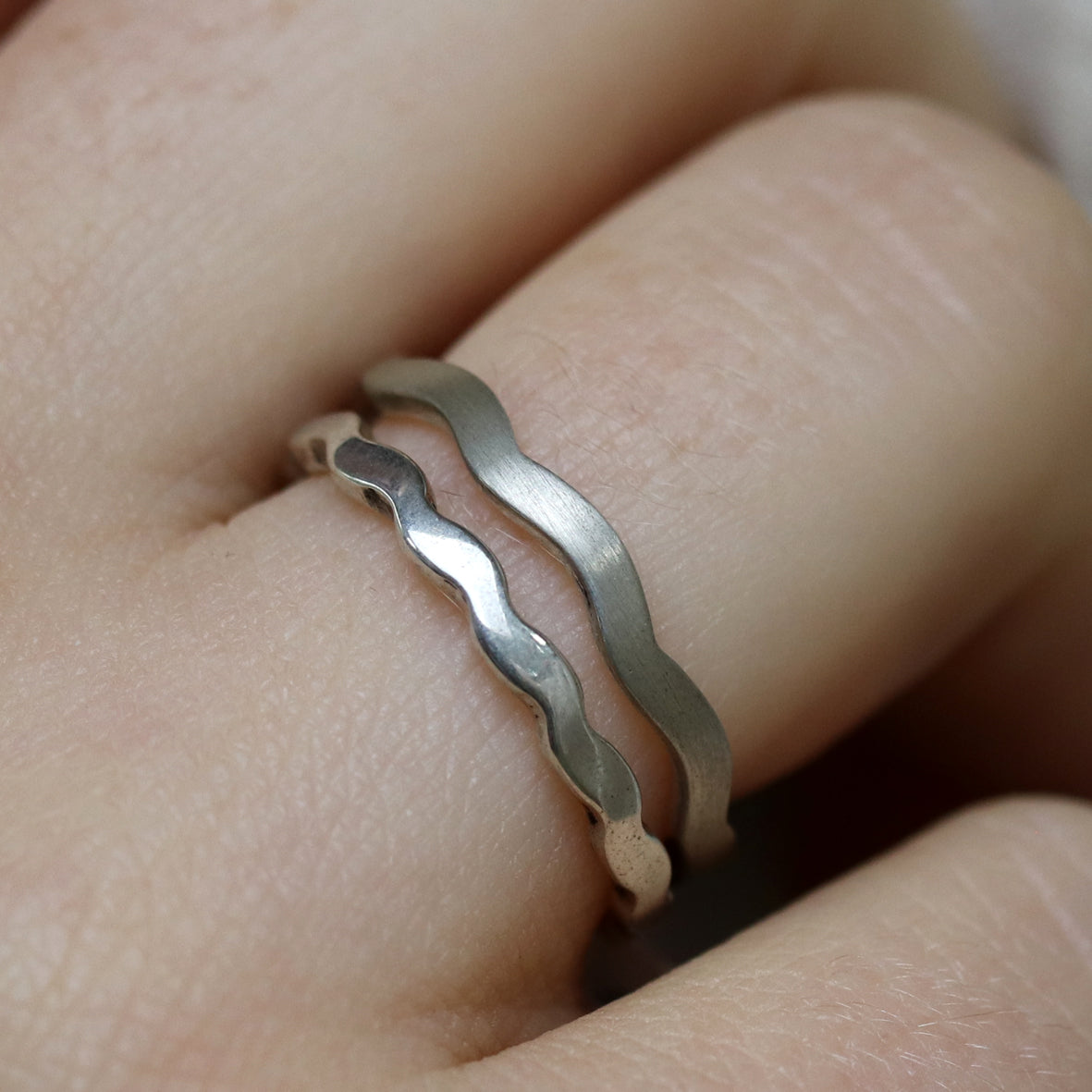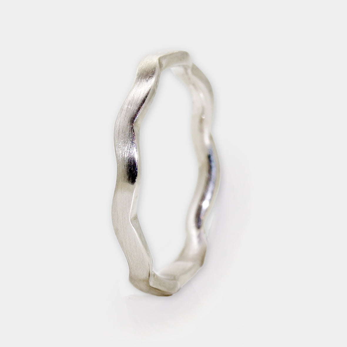 Der Wellenring zeichnet sich durch seine geschwungene, wellenartige Form aus, die an das Meer oder fließendes Wasser erinnert. Die geschwungene Form fängt das Licht auf einzigartige Weise ein und erzeugt ein faszinierendes Spiel aus Glanz und Schatten, das den Ring zu einem zeitlosen Schmuckstück macht.